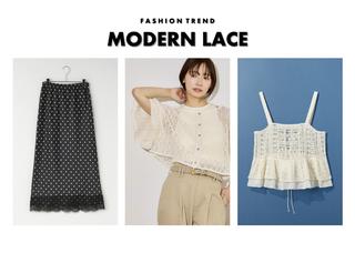 華やかで高揚感たっぷりな【レース】を今っぽく取り入れるなら、甘さのさじ加減がカギ。可愛くなりすぎず、でも華やかさはしっかりキープできるものが狙い目。今回ピックアップしたのは、1枚で着るのはもちろん、レイヤードしても楽しめるキャミやパーカー、スカートなど。甘すぎないレースで、いつもの着こなしをブラッシュアップ。
