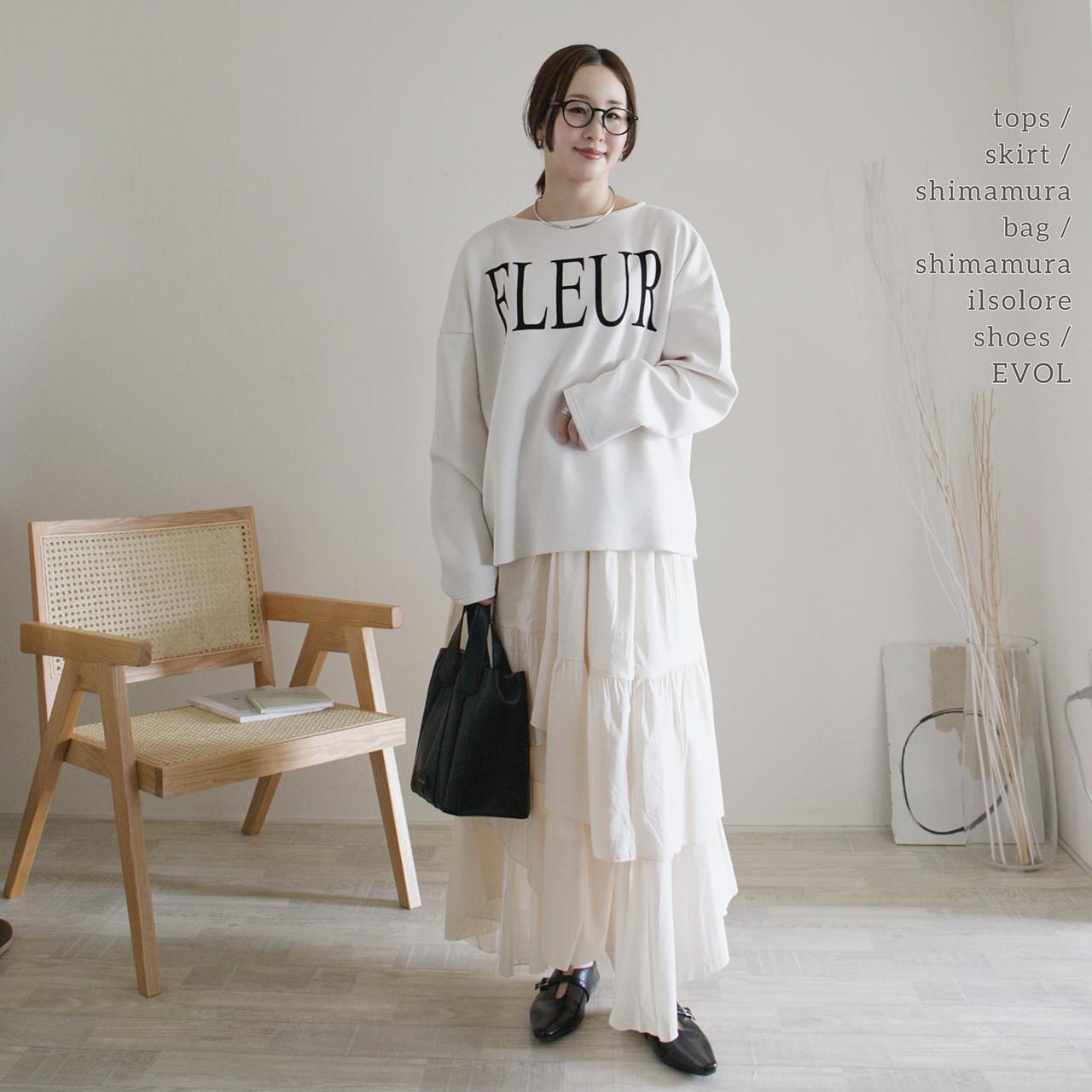 ボリュームスカートの甘さを程よくカジュアルダウンさせるなら、スウェットやロゴTなどのラフなトップスを合わせるのがおすすめ。トップスのゆるさとスカートの華やかさが絶妙にマッチし、リラックス感のあるこなれコーデが完成。甘さとカジュアルのバランスが絶妙な、大人の余裕を感じる着こなしに。