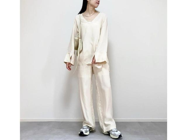 ナチュラルでやわらかい雰囲気に仕上がる淡色コーデは、大人女性からの人気も高い。ただ、着こなし次第では単調でのっぺりした印象に見えてしまいがちなのが難点です。そこで、足元にスポーティなV2Kランを投入すれば、引き締め役として貢献。メタリックなカラーがコーデに華やかさを加え、シンプルなワントーンコーデもぐっとサマ見えするはず。