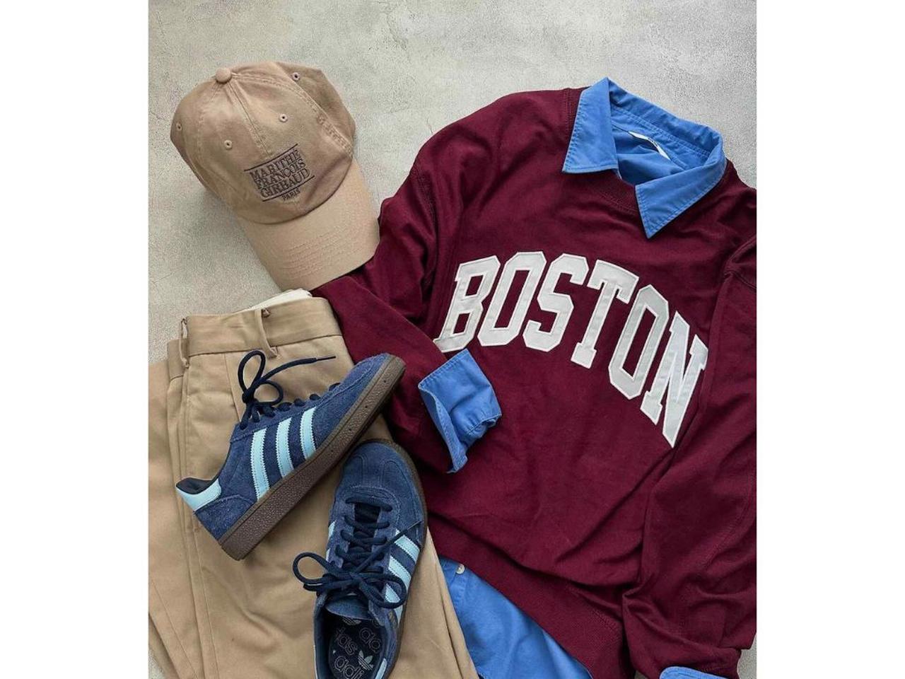 カレッジロゴのボルドースウェットにブルーシャツをレイヤードした、王道プレッピースタイル。シャツとリンクさせるようにブルーのアディダススニーカーを合わせれば、遊び心をキープしつつもまとまり感アップ。シーズンライクな足元が効いて、幼く見えがちなプレッピースタイルもぐっとあか抜け。
