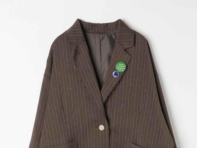 切りっぱなしのデザインや缶バッジなど、随所に遊び心が光るこちらは、肩の力を抜いて羽織れるカジュアルジャケット。ルーズなシルエットが生む余裕感が、大人のデイリースタイルにぴったりマッチします。濃紺のストレートデニムでシンプルに仕上げたら、足元はローファーやレザーブーツを合わせて大人の品を漂わせて。