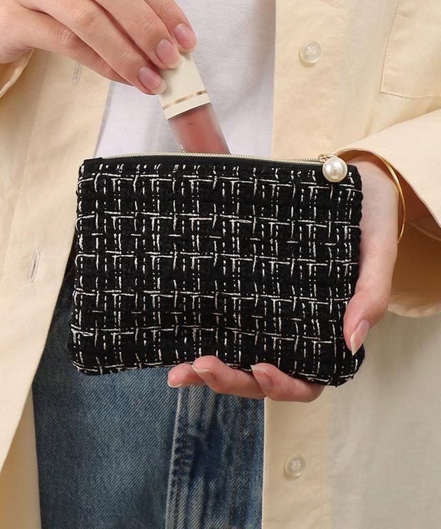 リップやアクセサリーなどを収納するのにぴったりなツイード風素材のミニポーチ。パール調のチャームがアクセントに。マチのないデザインだから、小さめバッグのときにもかさばらずに使いやすそうです。カラーはブラック、アイボリー、ピンク系の3色展開。
