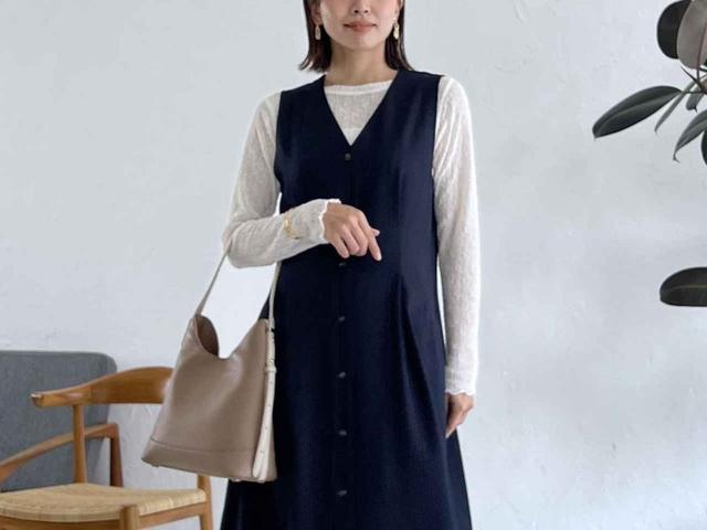 こちらは先に紹介したジャンスカをジレとして着回したコーデ。着丈が長いので、腰まわりをカバーしつつ、縦のラインが強調されてスタイルアップ効果が期待できます。カットソーにデニムといったシンプルなコーデも、ジレがプラスされるだけで奥行きが生まれ、グッとしゃれ感アップするのでぜひ真似したいところ。