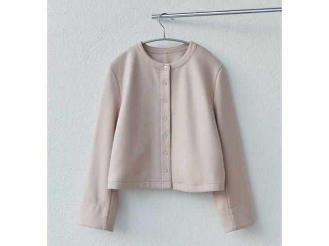 ノーカラーのカーディガン風ブルゾンは、すとんと落ちるシルエットに、フロントのスナップボタンがアクセント。公式サイトによると「やみつきになる肌触りと着心地」とのことで、デイリーに頼りたくなりそう。コンパクトなシルエットなので、フレアスカートやボリューミーなデニムとも好バランスに。