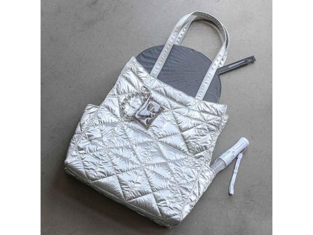 柔らかそうな見た目で、思わず触れたくなる中綿入りキルティングトート。シルバーカラーの光沢感が、さっと持つだけで華やかな印象に導いてくれます。マチ付きで口元にがファスナーもついているから、たくさんの荷物を安心して収納できそう。レジャーやアウトドア、ライブなど幅広いシーンで活躍してくれそうな一品です。