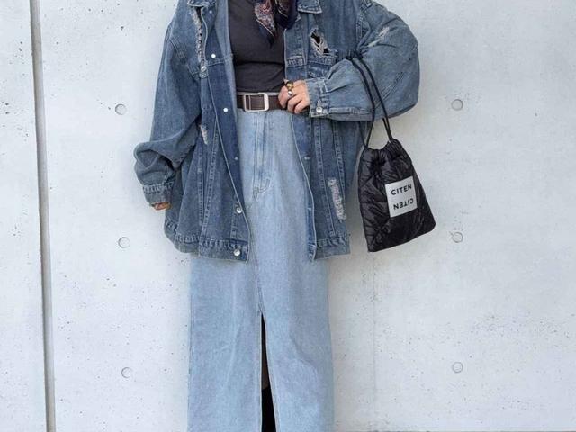 ダメージ加工が施されたデニムジャケットは、羽織るだけでグランジ感が漂う一枚。@aiii__13kさんはレトロなスカーフやデニムスカートに合わせて古着ライクな着こなしに。ニットもスウェットも着込めるオーバーサイズシルエットだからロングシーズン活躍の予感。