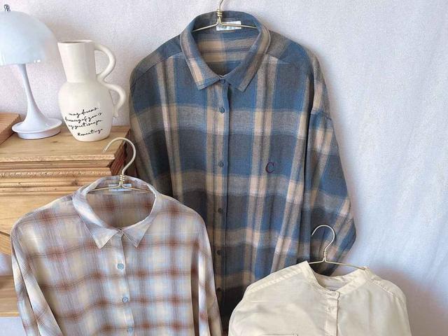 くすみ感のあるブルー × ベージュのチェック柄シャツ。落ち着いた配色ながら、あたたかみとは逆をいく涼しげなブルーが入るだけで気分転換に。軽やかに着こなすなら淡色コーデの羽織りに、コーデュロイやベロア素材を合わせて季節感たっぷりに仕上げるのもおすすめ。