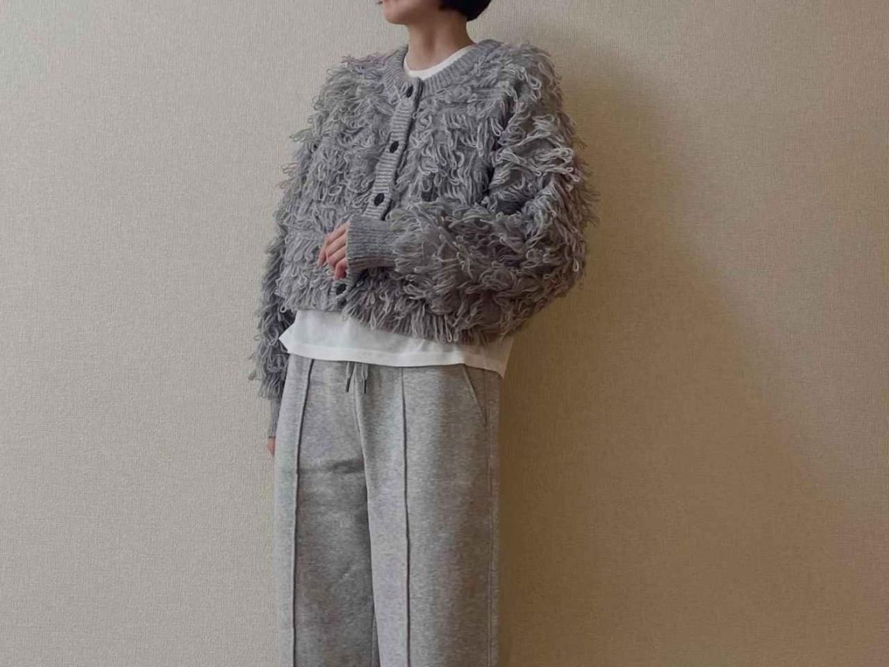 まず最初にご紹介するのは、ふわふわとした質感が魅力のループカーディガン。ボリュームのあるシルエットでありながら、コンパクト丈なので全体にメリハリがつきやすいところがポイントです。洗練された印象のグレーは、甘くなりすぎるのをセーブしてくれるので大人にもぴったり。白系のインナーをのぞかせて抜け感を演出するとすっきり見えが叶いそうです。