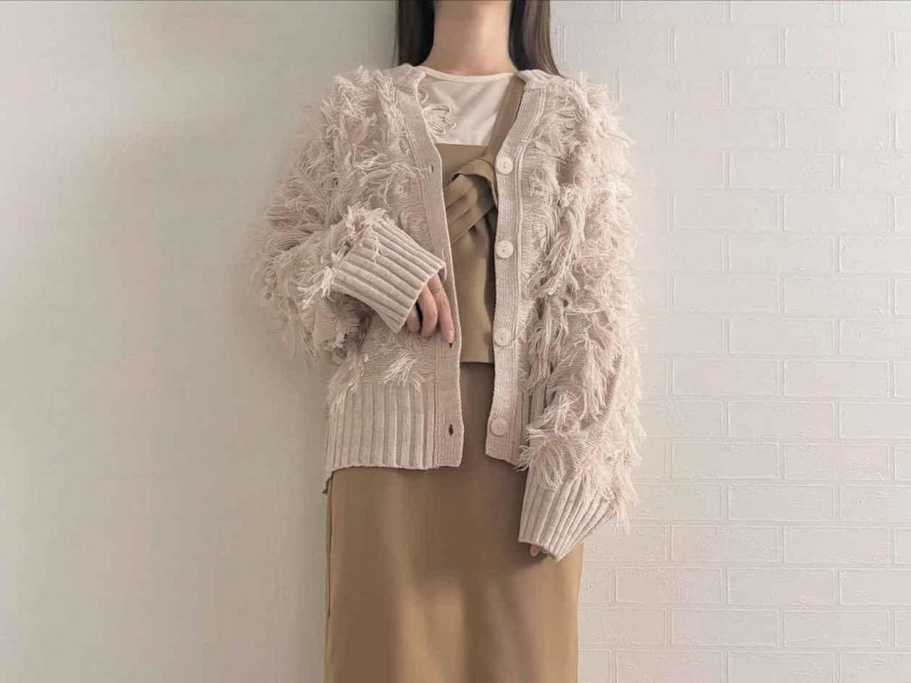 淡いトーンでまとめる日こそ、1枚で華やぐフリンジカーデが強い味方に。動くたびに揺れるカーデの表情が、ワンカラーのコーデにリズムを生み出してくれます。「羽織るだけでコーデが映える」と@chii_150cmさんもコメントするように、忙しい朝でも取り入れやすいのが◎ ベージュワンピの上に羽織れば、お出かけにもデートにもマッチするレディなカジュアルスタイルが出来上がります。