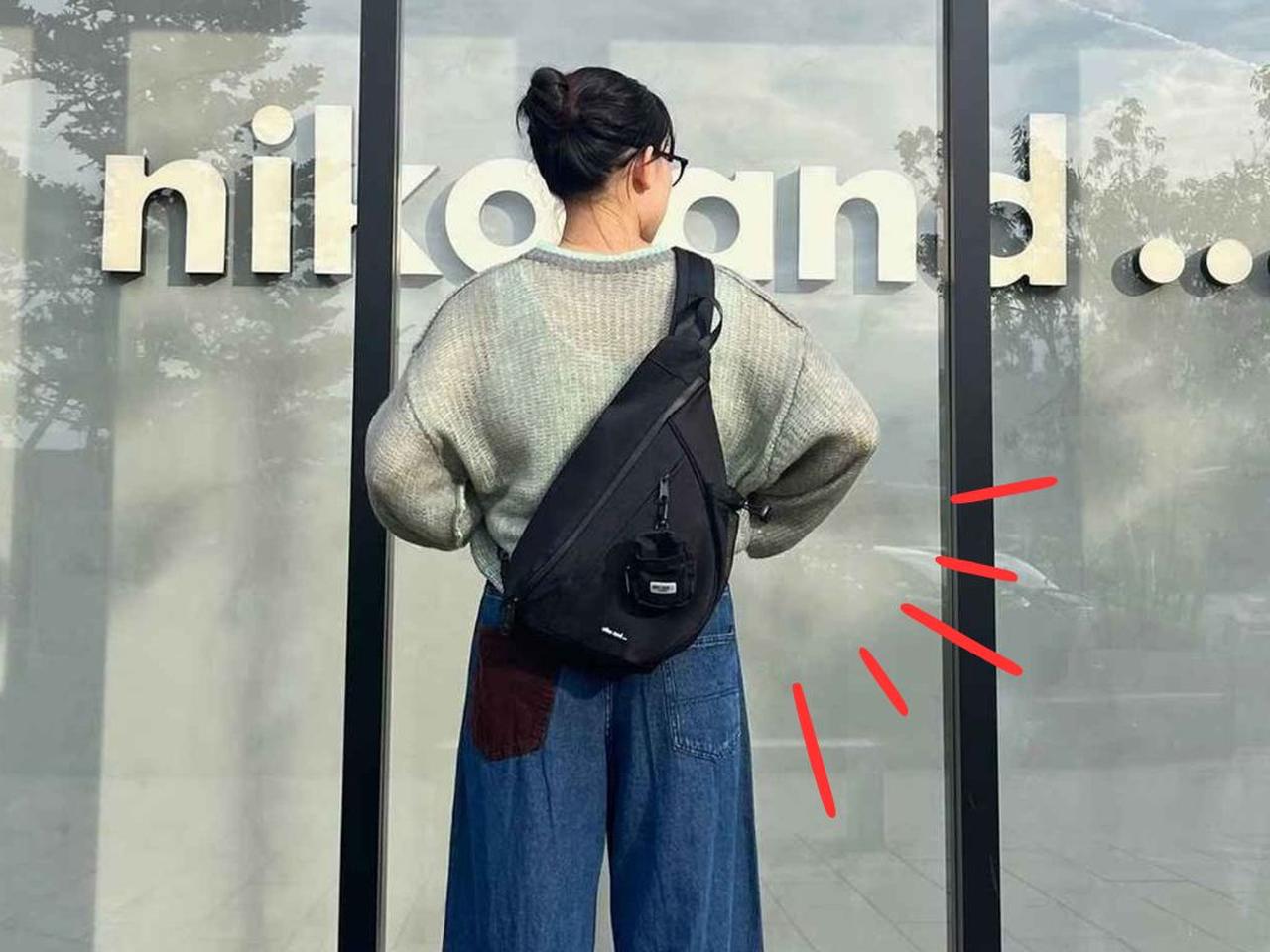 ゆるニット × 異素材デニムのラフなスタイルにスリングバッグを合わせることで、スポーティな要素が程よいアクセントに。大きすぎないサイズ感で、カジュアルに傾きすぎないのがポイントです。ちょっとした買い物で荷物が増えても安心の収納力があり、両手が空くラクさも◎ 冬の重たくなりがちな装いに、軽やかさとレトロなムードを添えてくれるバランスの良い組み合わせです。