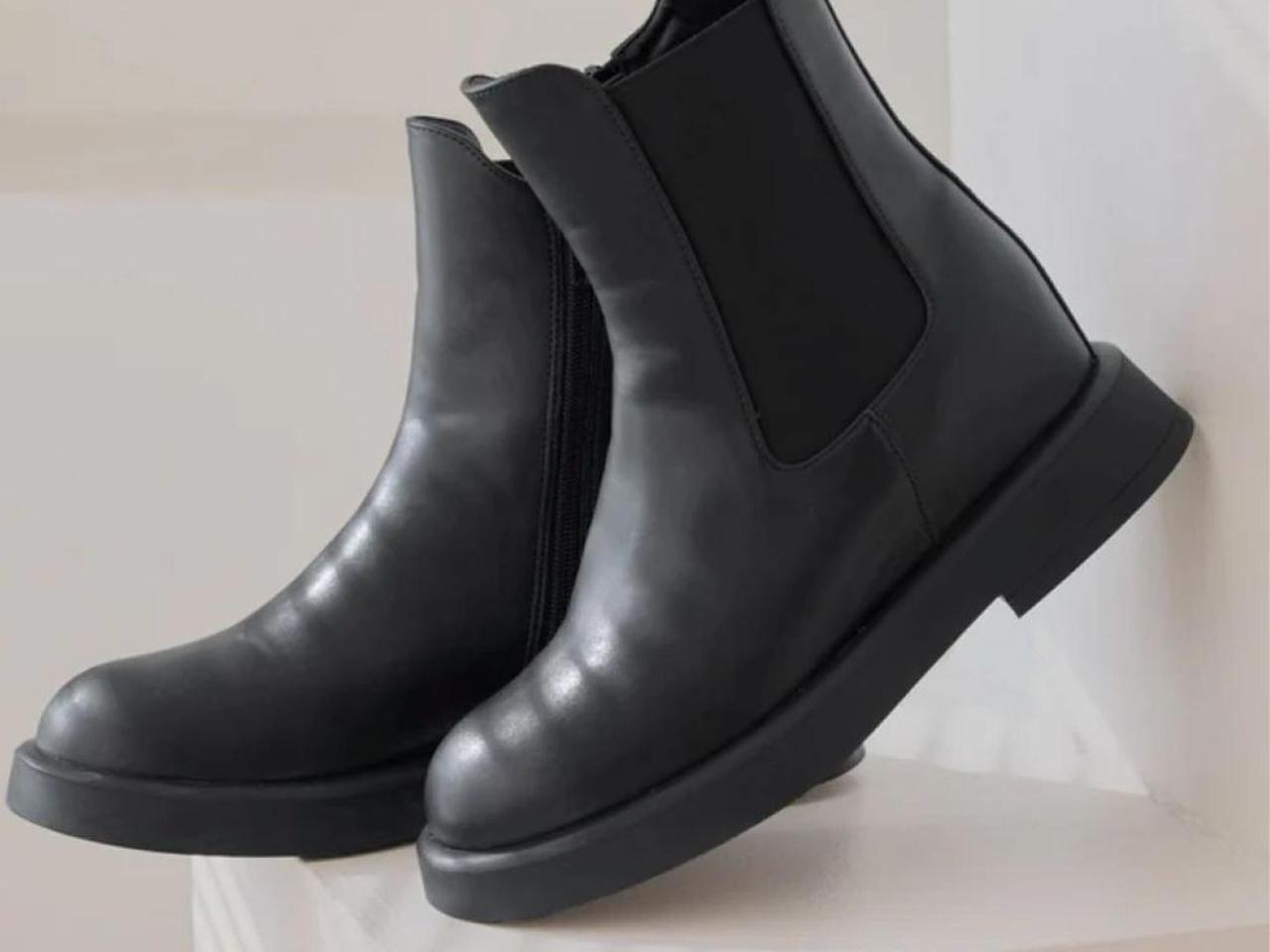 公式サイトによると「なめらかで程よいツヤのある合成皮革を使用し、本革のような上品な見た目」を実現したというサイドゴアブーツ。内側がジップアップになっていて、大きく開く履き口により着脱もラクな仕様となっています。ツルっとして凹凸が少ないアッパーなので、スタイリッシュなコーデからフェミニンなコーデまで楽しめるところもポイント。カラーはブラックとダークブラウンから選べます。では、スタッフさんの着こなしを見ていきましょう。