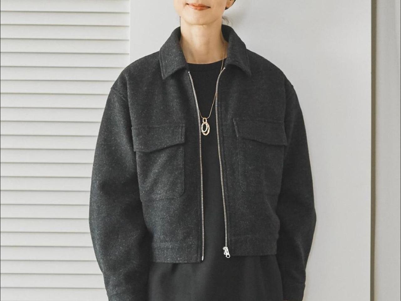 胸元のフラップポケットが動きのあるスタイリングに貢献してくれるジャケット。辛口なジップデザインがモードな雰囲気を引き寄せます。落ち着いた印象のチャコールグレーは、ブラックのワンピースと合わせてワントーン風にまとめてもおしゃれ。コンパクトな着丈で、全身のバランスをとりやすいところもGOODポイント。
