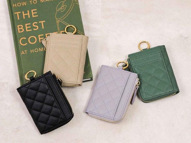 手にすっぽり収まるコンパクトサイズながら、カード入れ6つにコインポケットまで備えた収納力が高いミニポーチ。ダイヤ柄キルティング × レザー調素材がマッチして、プチプラとは思えないような高見えデザインに仕上がっています。中にはキーリングがついており、鍵の収納にも便利。カラビナ付きだから、バッグに取り付けやすくて◎