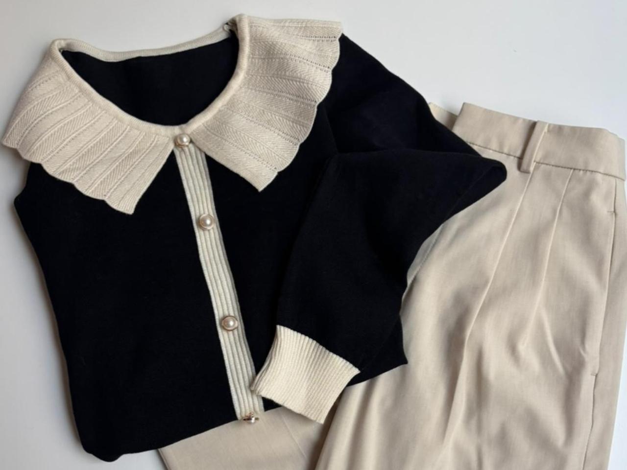 大ぶりの襟がコーデの主役になりそうなカーディガン風ニットプルオーバー。黒 × 淡いベージュトーンの配色やパール風ボタンが甘さをひと匙加えつつ上品な印象です。一枚でも存在感があるため、シンプルなボトムスに合わせるだけで即コーデが完成しそう。甘さを引き算するならデニムやマニッシュなパンツを合わせて大人っぽく仕上げて。