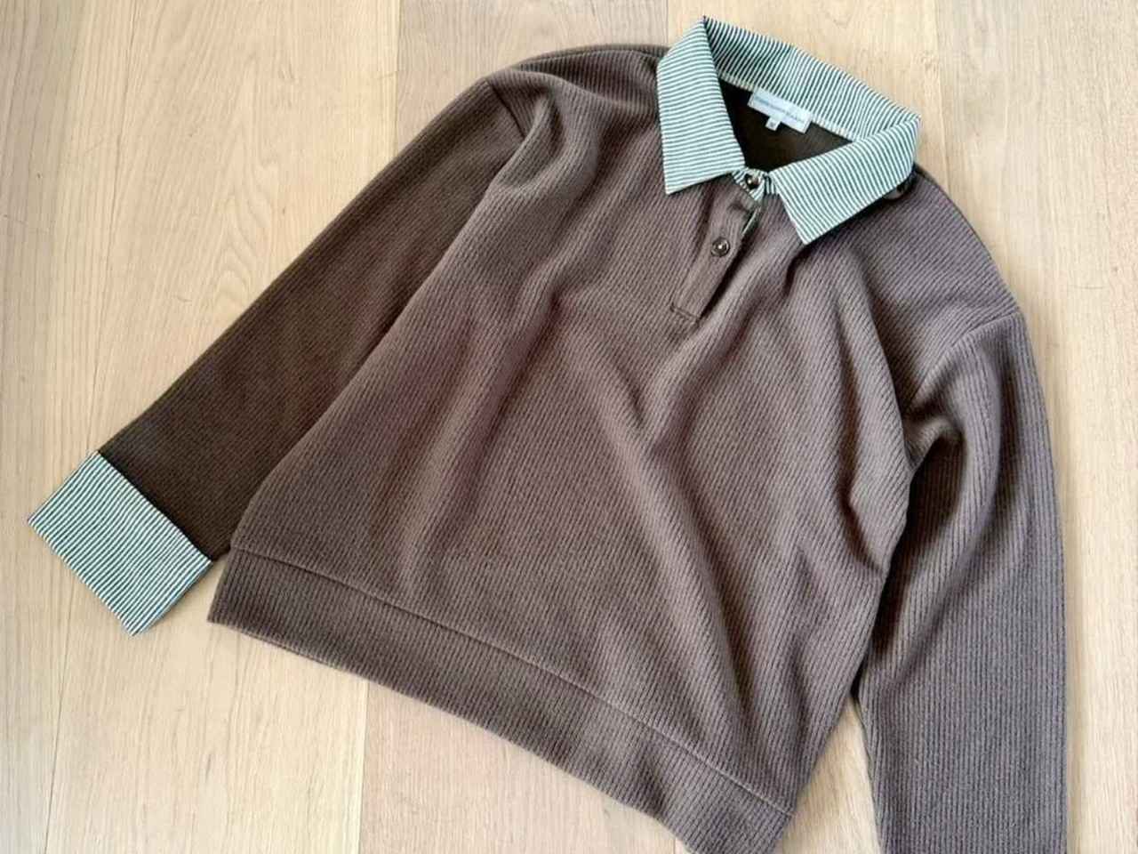 襟と袖口に配色を施したこのポロ風トップスは、一枚で完成度のある着こなしを作れるのが魅力。