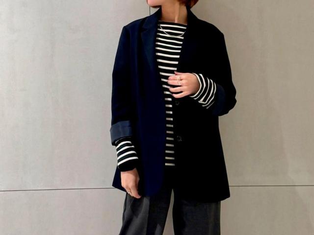 モノトーンボーダーをインナーに取り入れた、フレンチシックな冬のマリンスタイルです。ダークカラーのジャケパンコーデがフォーマルになりすぎると感じた時は、スタッフさんのように袖口をまくってボーダーをチラ見せするとカジュアルダウンできて◎ 「ジャケットを買ったけど、オケージョンシーンだけでなく普段も着たい」という人にもオススメの着こなしです。