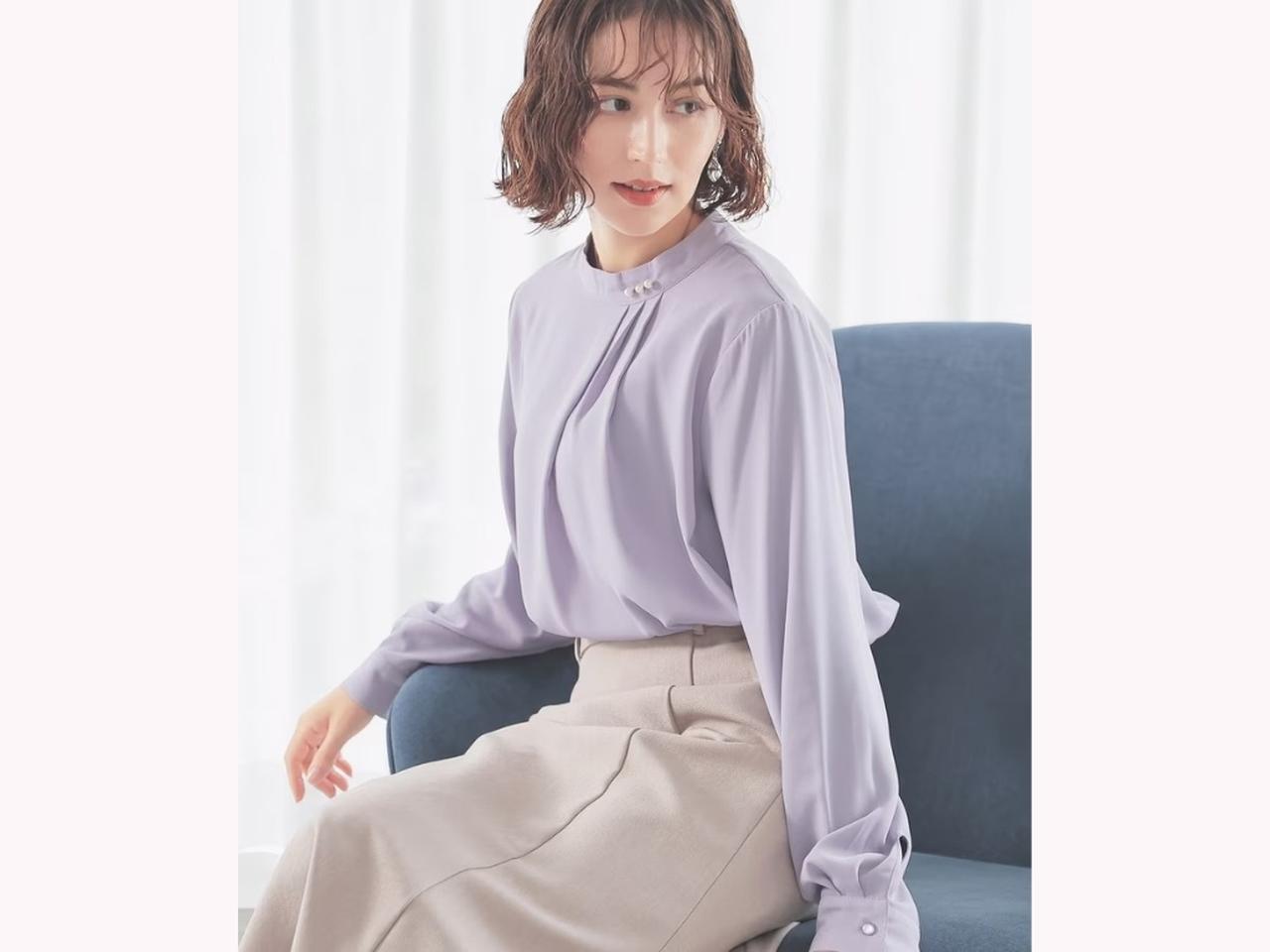 こちらは、衿元のパール風パーツが上品なブラウス。タックを効かせたデザインによって、左右でニュアンスの異なるアシンメトリーな表情が生まれています。裾に向かってゆるやかに広がるシルエットは、体のラインを拾いにくく、さりげなく体型をカバー。全4色展開で、ラベンダーカラーを選べば春先取りコーデを楽しめそうです。