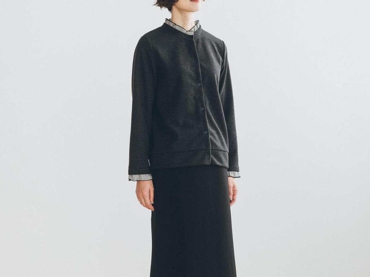 ブラック系でまとめたワントーンコーデは、シンプルながらも洗練された雰囲気。襟元と袖口のフリルがさりげないアクセントになり、モノトーンでも表情豊かにまとまっています。トップスにデザイン性がある分、スカートはすっきりとしたシルエットでバランスよく。足元にブラウンを添えたことで重見えしにくく、上品さの中にやわらかさを感じるスタイルに仕上がっています。