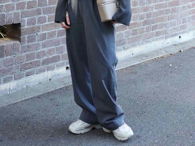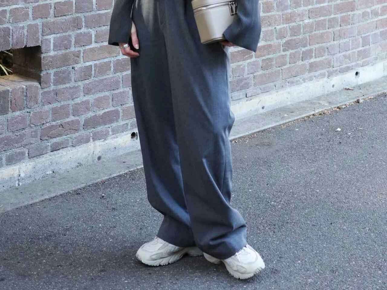グレーで統一したシンプルなワントーンコーデに、アイボリーのスニーカーを合わせて軽やかさをプラス。色味を抑えることで、落ち着きのある都会的な印象にまとまっています。スニーカーにもワイドパンツにもボリュームがあるので、トップスはコンパクトなシルエットを選んで全体のバランスを整えるのがポイント。