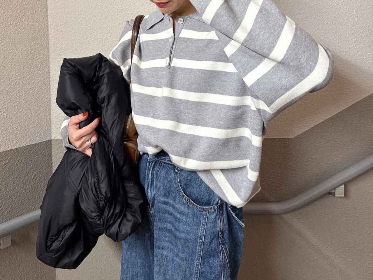 まずご紹介するのは、ゆったりとしたシルエットが今っぽい、抜け感たっぷりのニットポロ。存在感のあるワイドボーダーは、1枚だけでサマになるのが魅力。柄の主張がはっきりしているので、ジーンズを合わせたシンプルな装いも即こなれた印象に仕上がります。グレー × ホワイトの柔らかな配色で、程よく女性らしさを演出できるのも嬉しいポイント。