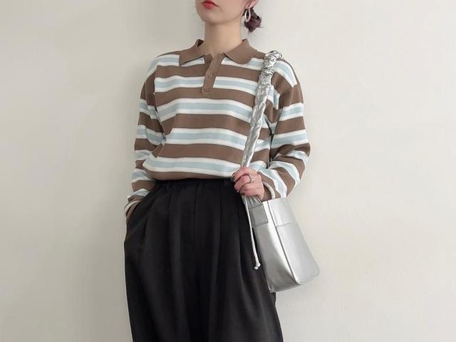 一枚で着映えとトレンド感を両立するなら「ブラウン × ブルー」のラガーボーダーポロに注目してみて。きちんと感のある襟付きデザインが今季らしいトラッドなムードを引き立て、カジュアルな装いも品よくまとまります。おすすめは、ゆったりとしたワイドパンツやスラックスとの組み合わせ。肩の力が抜けた、大人のこなれスタイルが完成します。
