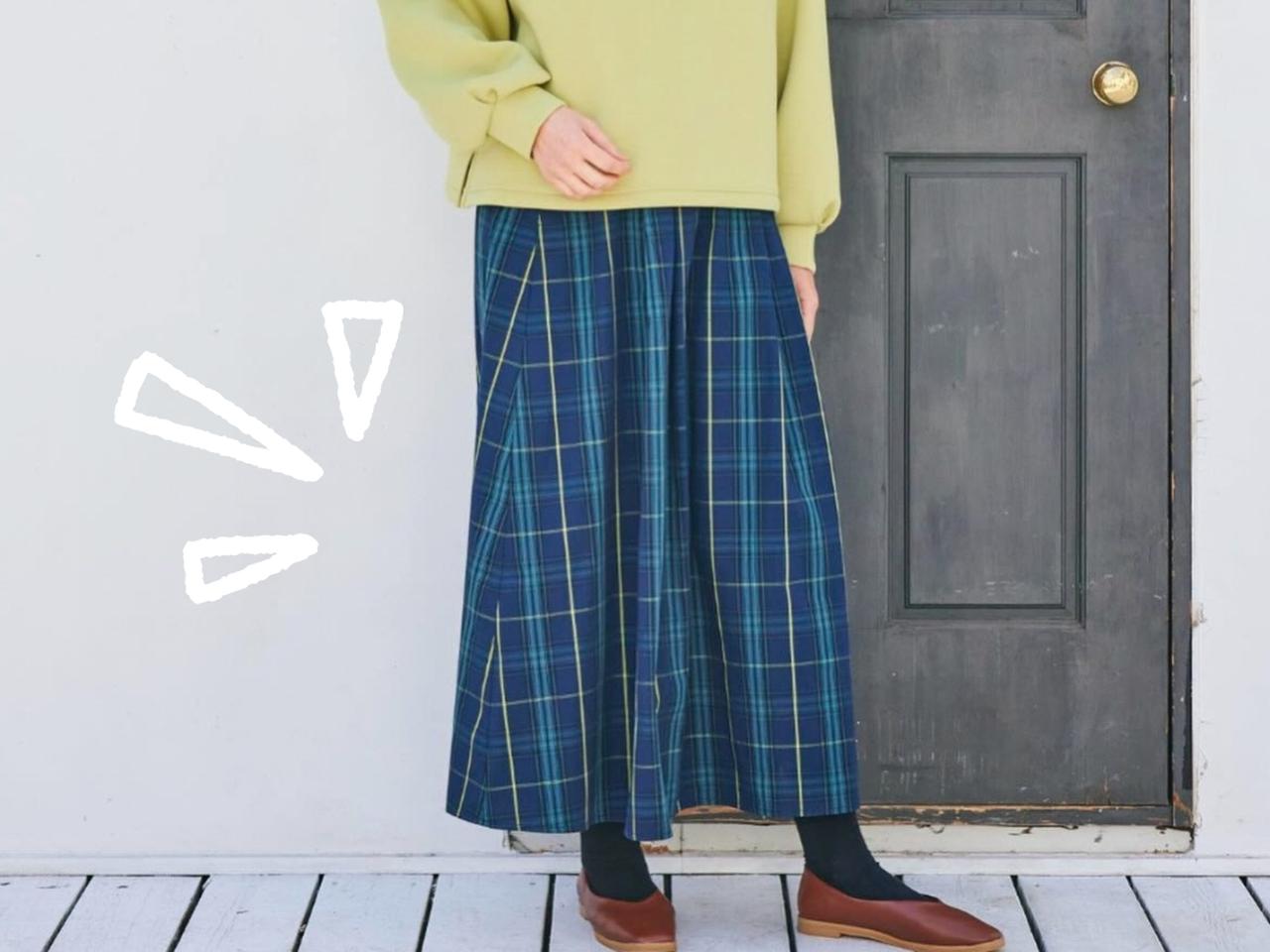 ネイビーベースにブルーやイエローの配色が効いたチェック柄スカート。トラッドに着こなすのはもちろん、ライトグリーンのトップスを合わせれば、程よく遊び心のあるカラーコーデを楽しめます。公式サイトによると「ウエストゴムで着脱や着心地がラクちん」とのこと。ポケットも備わっていて、ちょっとした小物やスマホを入れられて便利。