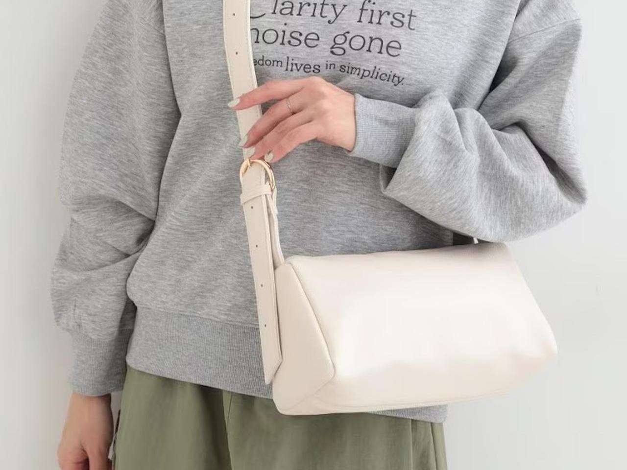 ボストンバッグのようにしっかりマチのあるスクエアフォルムで、収納力が期待できるショルダーバッグは、レザー調できちんと見えが狙えます。キレイめスタイルにはもちろん、画像のようなスウェットスタイルに合わせて大人カジュアルに仕上げるのも◎