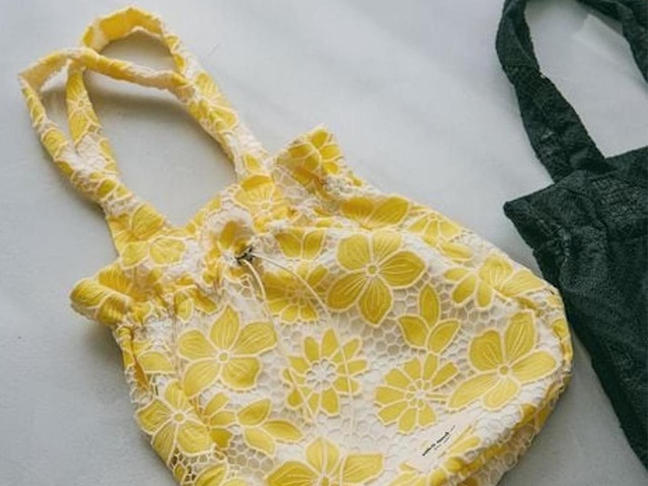 立体感のあるレース × 花柄刺繍が華やかなトートバッグ。どこかレトロな雰囲気漂うイエローが着こなしのアクセントになりそう。A4サイズや13インチのパソコンも入る収納力を備えているから、荷物が多めな人にもおすすめです。ドロストコードをきゅっと絞れば巾着タイプにもなるので、コーデや荷物の量に合わせてアレンジしてみて。
