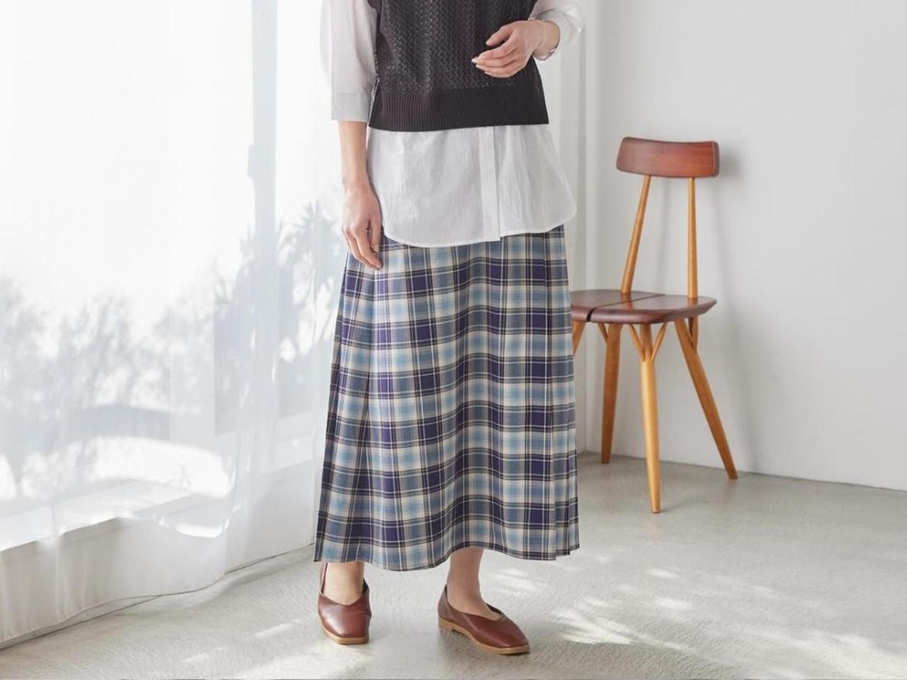 淡いブルーを基調としたチェック柄が、凛とした清涼感を運んでくれそうなプリーツスカート。プリーツが動くたびに揺れ、歩く姿をエレガントに見せてくれそうです。落ち着いたトーンの配色で、甘くなりすぎず知的なムード漂うのが大人に似合う理由。白のシャツやシンプルなベストを合わせれば、オフィスシーンや学校行事など、きちんと感が求められる場面でも好印象を与えられそう。