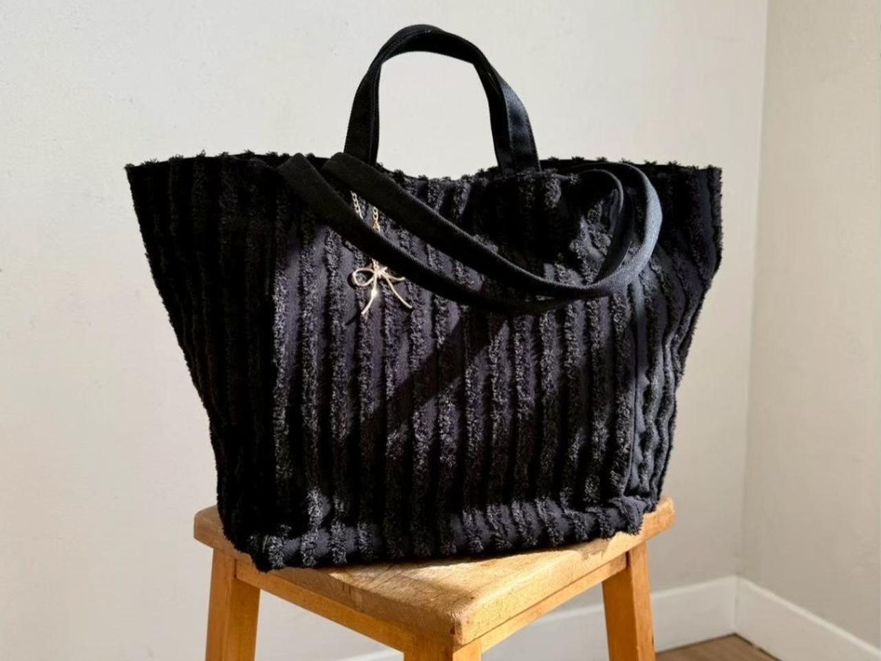 起毛でストライプを表現した、存在感抜群のビッグトートバッグ。ゴールドの小さなリボンチャーム付きで、ブラック一色でまとまったシックな佇まいにかわいさを添えています。手提げと肩掛けの2WAY仕様だから、荷物の量やシーンに合わせて使い分けられる実用性の高さも魅力。ちょっとしたお出かけから荷物が多くなりがちなレジャーシーンまで、幅広く活躍してくれそう。