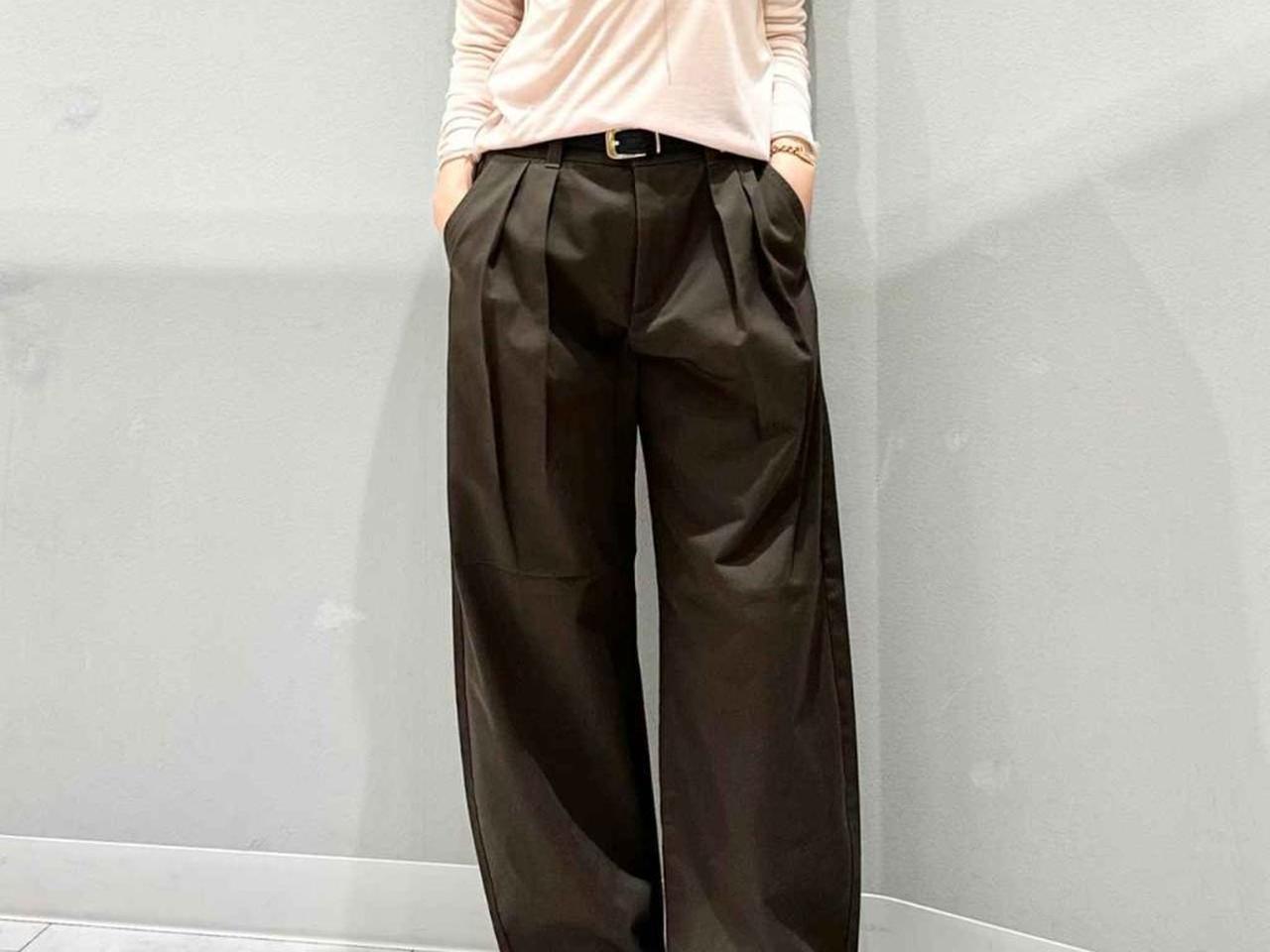 公式サイトで「ベストセラー」と紹介されている、こちらのタックパンツ。内側に向けてタックを入れることによって腰まわりが広がりにくいうえ、縦のラインを強調してくれるのが魅力です。太ももから裾に向けて緩やかにカーブを描くバレルシルエットも、足のラインをカバー。キレイめにもカジュアルにも振れるから、ヘビロテ待ったなしかも。