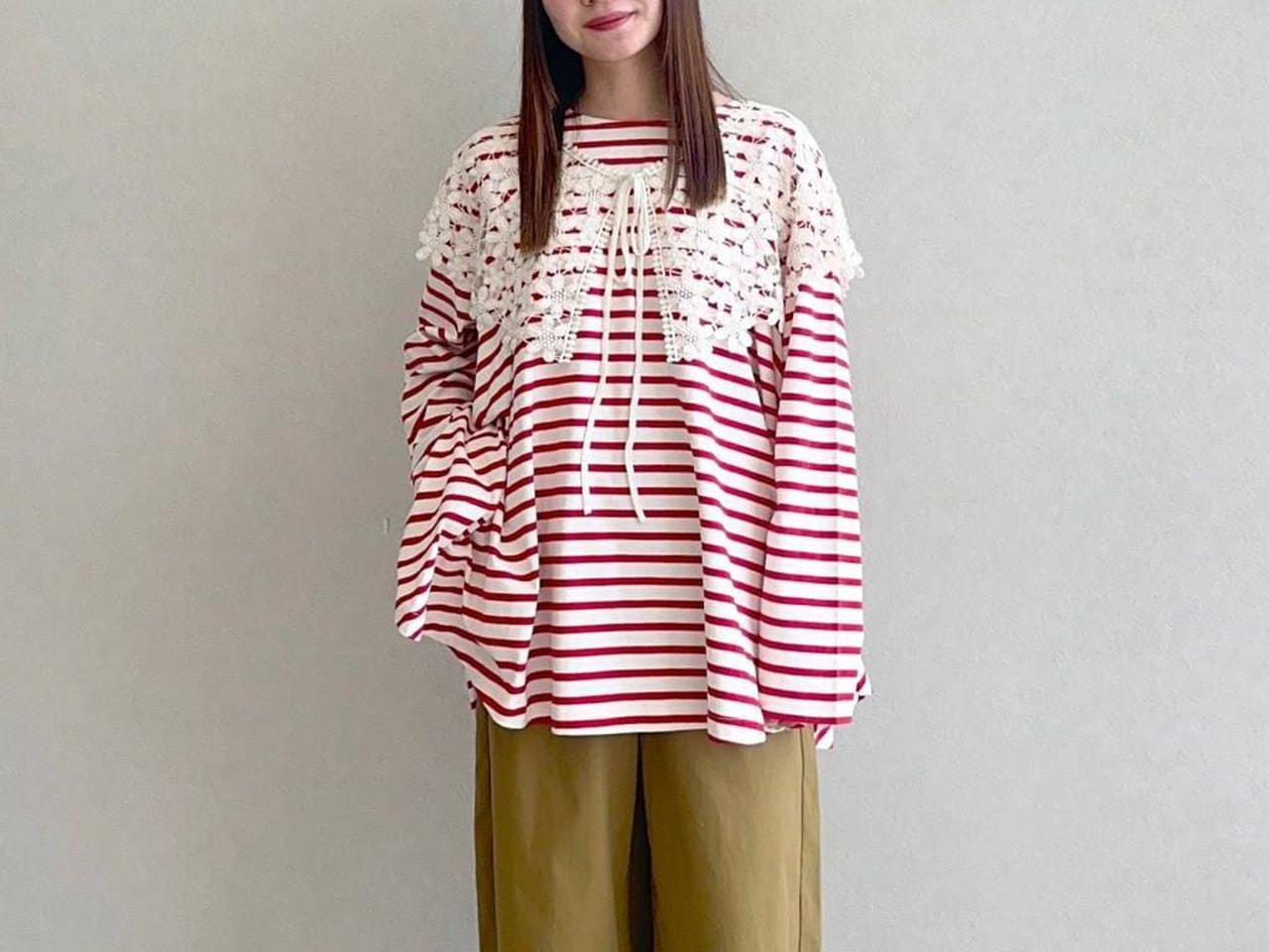 このコーデでメインにしたのは、レース襟のついたボーダープルオーバー。そのまま着るだけで旬の組み合わせが楽しめ、手軽にトレンド感を取り入れられるのが魅力です。甘さを抑えたい日は、襟を外してシンプルに着こなすのもOK。袖のデザインも可愛らしく、スカートに合わせれば春らしいお出かけコーデに仕上がります。