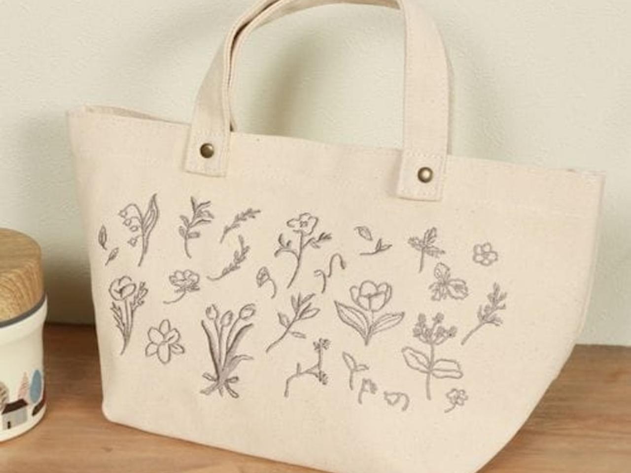 ナチュラルな色味と素朴なタッチのフラワー刺繍が魅力のランチトートは、派手なデザインや柄に抵抗がある人も取り入れやすいデザイン。マチが14cmとしっかりあるので、お弁当や水筒もすっぽり収まりそう。間口にはスナップボタンも付いており、中身が見えにくいのもポイントです。