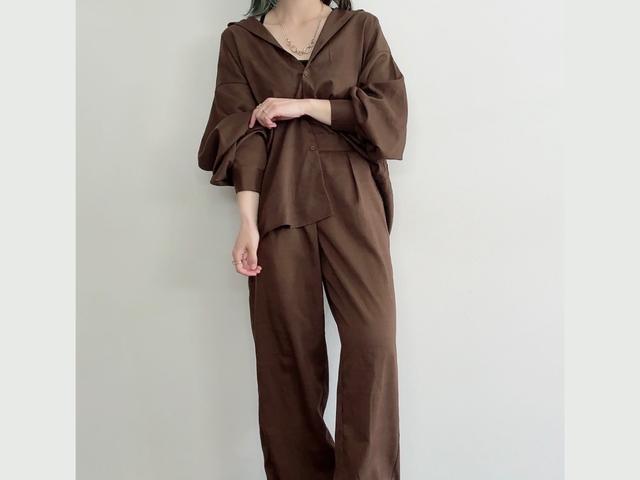 落ち感のあるシャツとパンツは、上下セットで着用するとグッと大人っぽい雰囲気に。リラックス感のある見た目で肩の力を抜きつつも、統一感を出してラフになりすぎるのを回避できそうなところがポイントです。トップスとボトムスの組合せを難しく考えなくとも、コーデが簡単にきまりやすいのがうれしいところ。