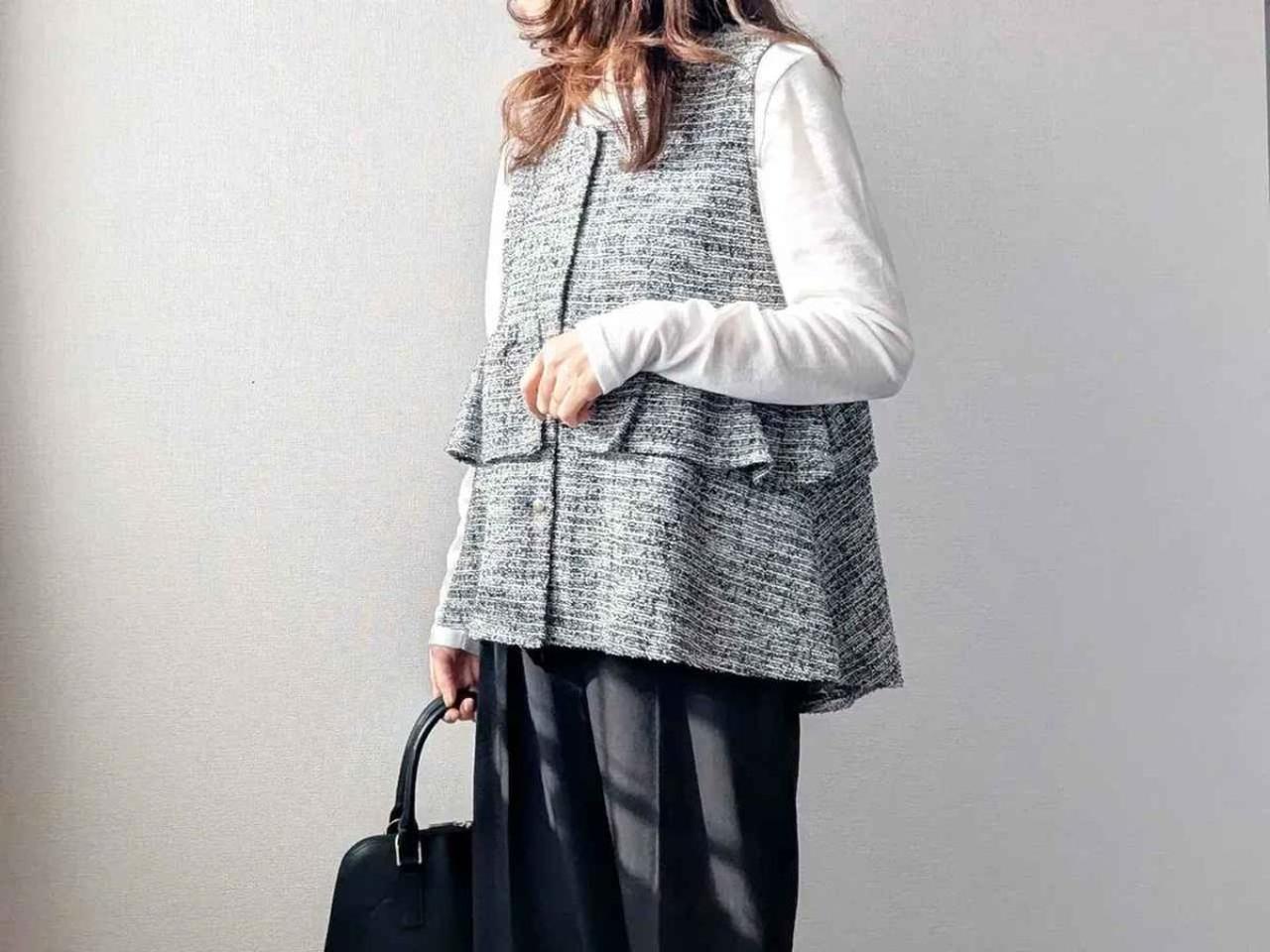 ふんわりフリルが華やかなムードを演出するジレ。インスタグラマーの@marino12131さんが「体型が変わっても着られそうなデザイン」とコメントしているように、後ろが長めのヘムデザインで体のラインを拾いにくいのが魅力。細かなチェック柄でほどよくきちんと感があり、セレモニーシーンにもなじみやすく、シックなパンツで上品に、デニムパンツでカジュアルにも着回せます。