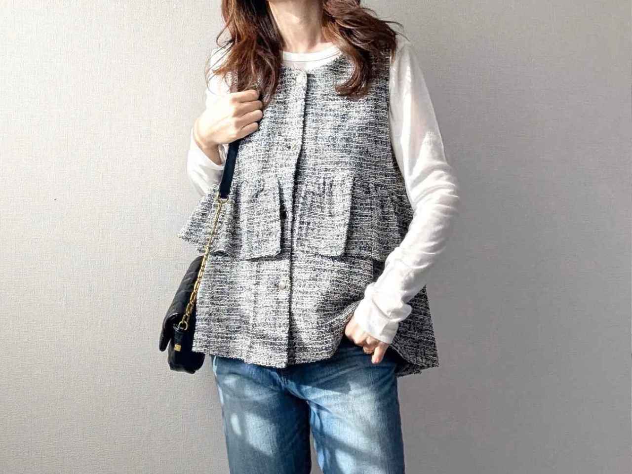 プチプラアイテムを使ったコーデを投稿している@marino12131さんが「持っていたら色々なシーンで活躍しそう」とコメントするツイード調ジレ。フリル使いが目を引くこちらは、モノトーンを選べば、ぐっと大人っぽい印象に。腰にかかる丈感で、気になるお腹まわりをカバーしながら着られそうなのもGOOD。きれい見えするジレに、あえてジーンズを合わせてカジュアルダウンする着こなしも◎