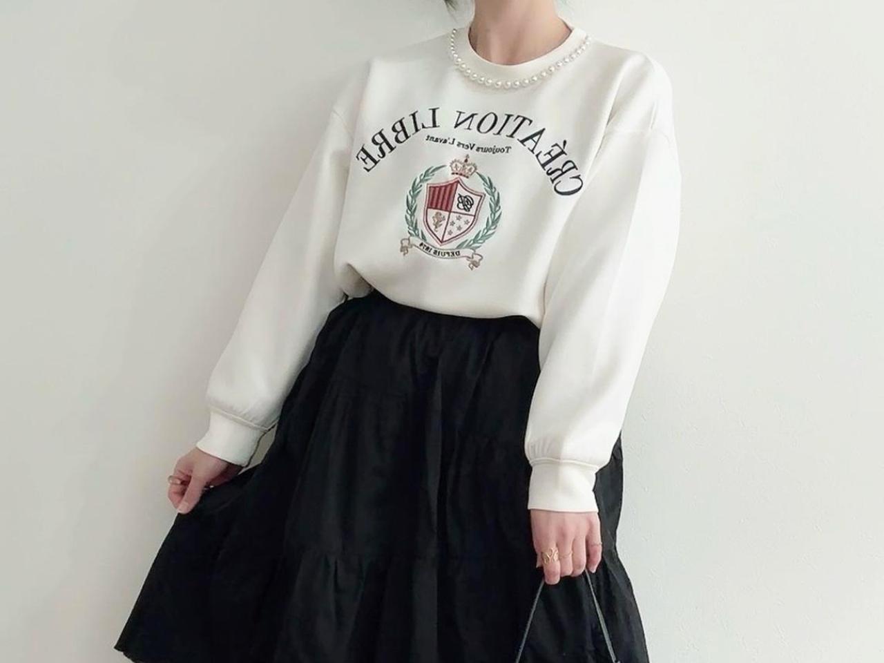 まずご紹介するのは、一枚でサマになるパールディテール付きロゴスウェット。ラフな印象になりがちなスウェットも、胸元にあしらわれたパール調のアクセントや白の清潔感があれば、華やぎと上品さを同時にアップ。アクセサリーを身につけなくても、しっかり着映えを狙えることができます。ボリュームのある甘めスカートと合わせれば、甘さとラフさのバランスが絶妙な旬のMIXスタイルが完成。