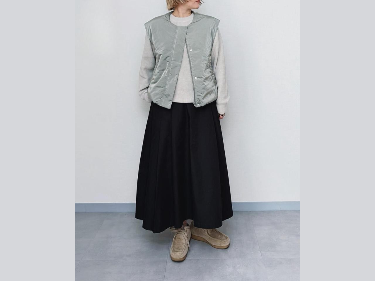 華やぎのあるシルエットでありながらベーシックさもあわせ持つ無印良品のフレアスカートは、さまざまなトップスに合わせやすいのも魅力。ベストを使った旬のレイヤードスタイルにもすっとなじみ、トップスの魅力を引き立ててくれます。ニュアンスカラーでまとめた上半身に、黒のフレアスカートがほどよい引き締め役に。