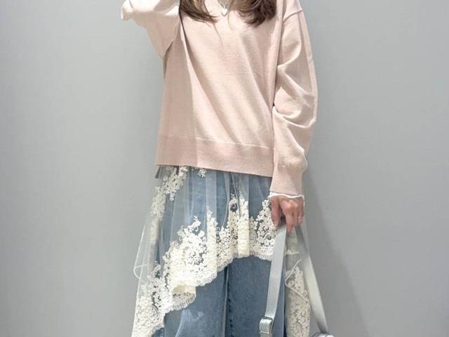 全体に施されたフラワーレースが、春の光に映えるプルオーバー。ストレッチのきいた素材感で着心地もよさそうで、キャミソールの上にさらっと重ねるだけでヘルシーな肌見せスタイルが完成します。ほどよく体にフィットするシルエットが女性らしさを引き立て、大人の余裕を感じさせる佇まいに。キャップやスニーカーでややカジュアルダウンすると、ヘルシーさとラフさが混ざったミックススタイルが楽しめます。
