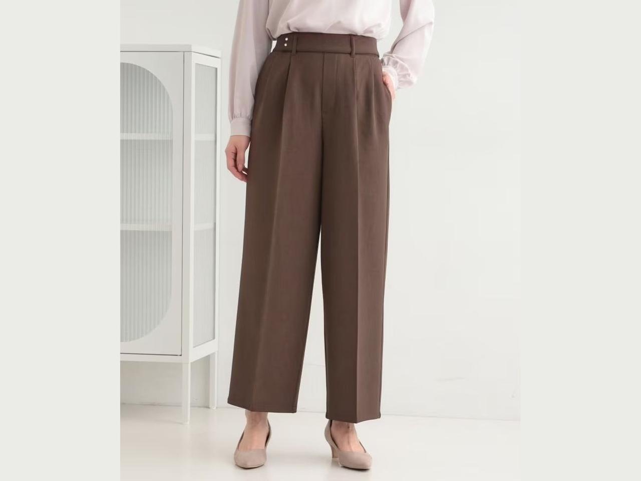 ベーシックで着まわしやすい、タック入りのワイドシルエット。気になる腰まわりや太ももをカバーしつつ、すっきり見えも叶えてくれそうです。ベルトループ付きで、きれいめな印象に仕上がるのもポイント。ブラウスやシャツを合わせれば、通勤や参観日などのきちんとシーンにも活躍の予感。全4色展開。