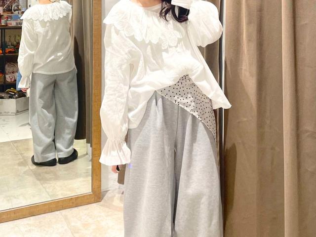 ラフなムードになりがちなスウェットパンツは、甘めブラウスを合わせてバランスを調整すると◎ 立体感のあるフリルブラウスを合わせることで、コーデに奥行きと女性らしさがプラスされます。上下が淡めトーンのときは、スカーフで柄を足したり、足元に引き締めカラーを取り入れたりするのもしゃれ見え効果がありそう。パジャマのような印象を回避しつつ、メリハリのある着こなしに仕上がります。