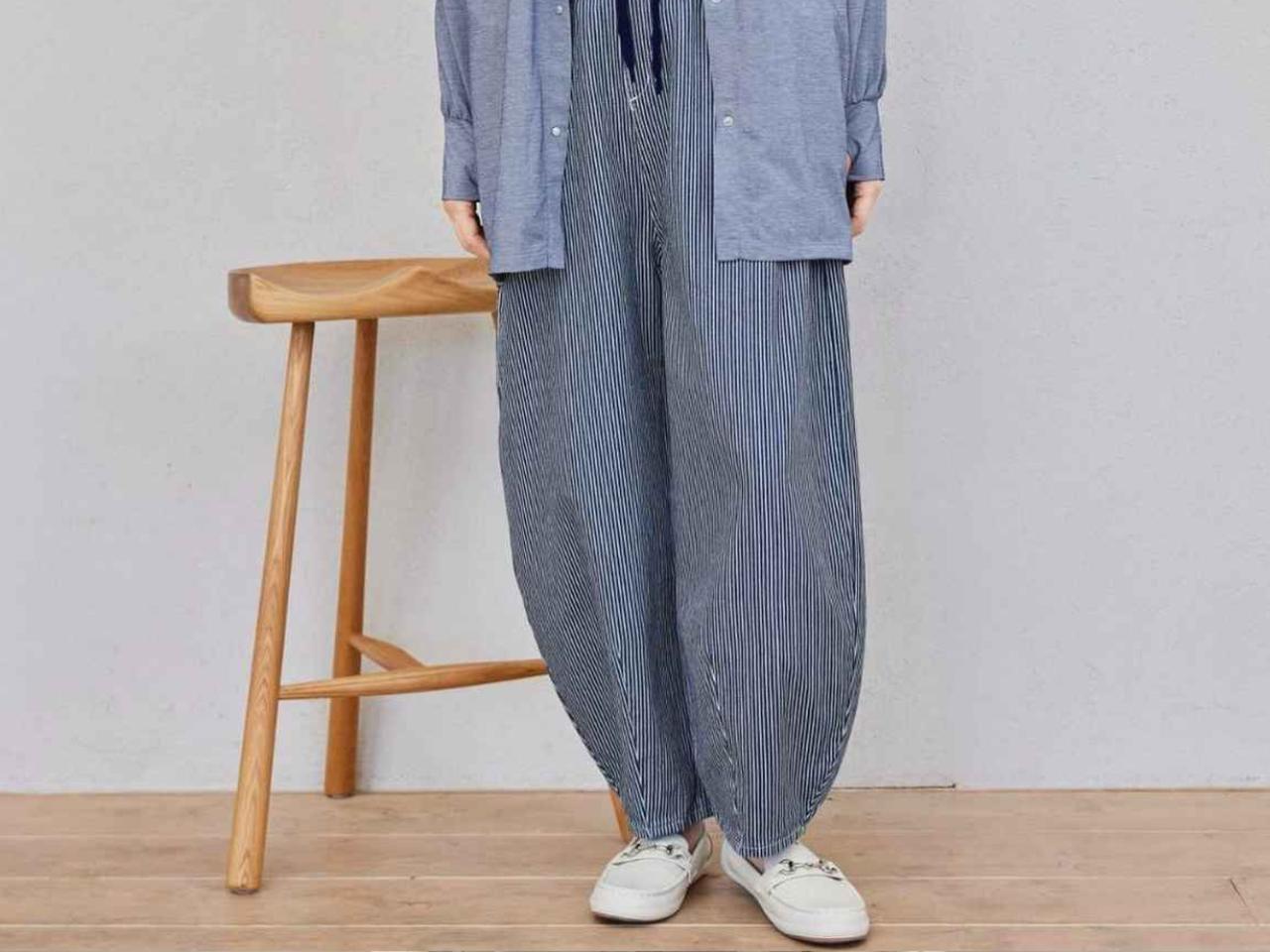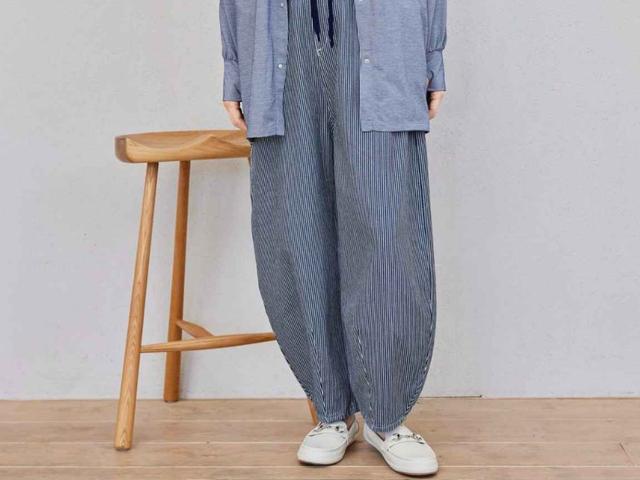 コーデの涼感をグッと上げるストライプ柄のコクーンパンツ。遊び心のあるワイドなシルエットのおかげで、堅苦しくなりすぎずこなれた印象をアピールできるはず。アウターに同系色のパーカーを合わせれば、ワイドなパンツも重く見えすぎず、軽やかな雰囲気に。ウエストについた黒の紐が、ちょっとしたアクセントポイントになってくれるのも嬉しいところ。
