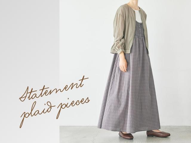 主役級の存在感があるキャミワンピースは、華奢なストラップが女性らしさを引き立てます。細かいチェック柄 × シックな色味なら派手になりすぎず大人のムードで着られそう。Tシャツ合わせでカジュアルダウンしたり、シアートップスで今っぽい抜け感を添えたり、インナー次第でロングシーズン表情を変えて着こなせるのも魅力です。
