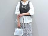 白地にブルーの小花柄がプリントされた、春にぴったりな配色のブラウス。デニム合わせの爽やかなカジュアルコーデも可愛いけれど、実はキャメルなどベージュ系のパンツとも相性抜群。小物はブラウスに合わせて白で統一するとグッドバランスに。