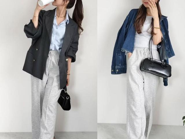 楽に過ごせるのが魅力のスウェットパンツは、部屋着見えしないよう注意も必要。こちらのコーデのようにデニムジャケットを肩掛けしてシャレ感を出せば、こなれ度高めなお出かけスタイルに。インナーとパンツをカラーリンクさせた統一感のある着こなしがグッドです。レザー調のバッグやシューズなどで高見え感を狙うテクも、ぜひ真似したいところ。
