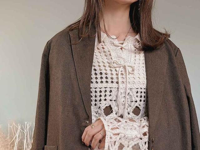 オンライン限定アイテムだというクロシェ編みニットは、着るだけで女性らしいムードが高まる一枚。ざっくりとした編み目がコーデに立体感を生み、ジャケット下でもしっかり映えます。デニムと合わせてカジュアルに、ブラウンのセットアップのインナーに着てシックに。どちらにも振れるその多彩な表情に引きつけられそう。
