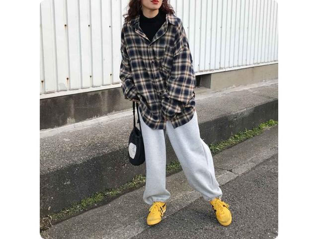 オーバーサイズのチェック柄シャツにスウェットパンツを合わせた秋にぴったりのリラックスカジュアル。こんなラフな装いも、イエローのスニーカーを添えるだけで印象が引き締まり、シャレ感も高まります。ニュートラルなグレーは、イエローの鮮やかさをしっかり引き立てつつも全体を落ち着かせてくれるので、初心者もトライしやすい組み合わせ。