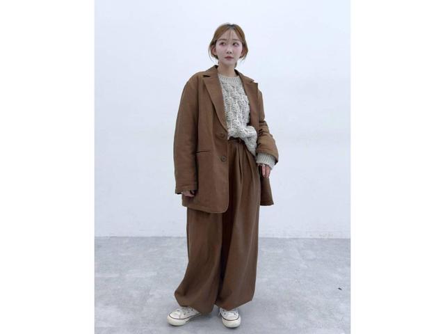 ブラック、ネイビー、ブラウンの3色展開の中でも、今季ひときわ注目を集めているのがトレンドカラーのブラウン。こっくりとした色味がコーデに深みを与え、取り入れるだけで旬のムードを漂わせてくれます。ブラウン × グレーのニュアンスカラー同士の組み合わせなら、それだけで小洒落た印象。