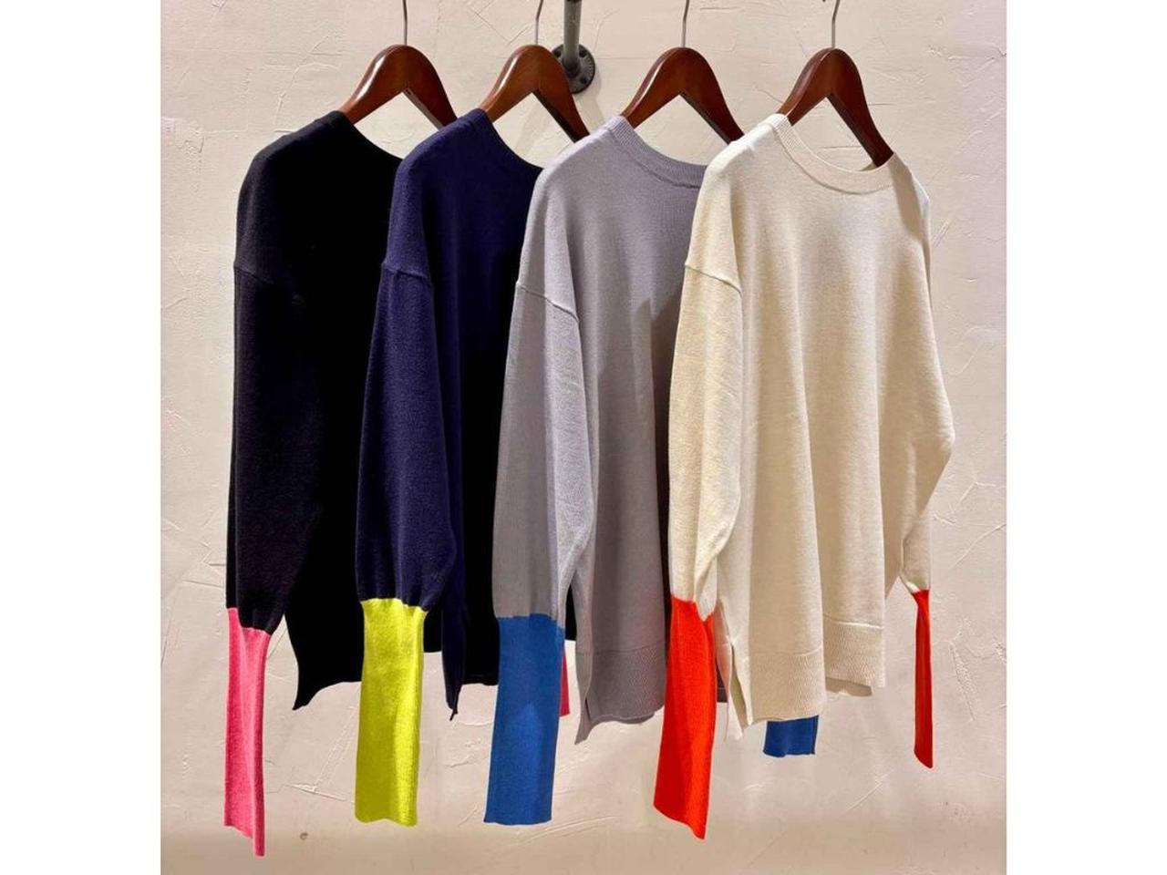注目したのはこちら、袖の切替えが特徴的な配色ニットトップス。薄手タイプなので、1枚でもレイヤードでも着回しやすいところが魅力です。レーヨン混の「とろみのある柔らかい肌触り」(公式サイトより)だから、ゴワゴワしたニットが苦手な人にもおすすめ。普段はカラーをあまり着ないという人にも、ぜひ試してほしいアイテムです。