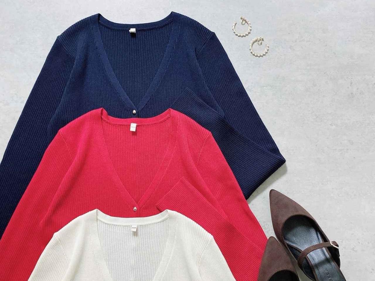 深めのVネックに高級感のあるゴールドボタンをあしらったカーディガン。リブ素材の縦ラインがすっきりとした印象を演出し、裾のスリットがさりげないアクセントになっています。ベーシックなデザインで、どのカラーも着回しやすそう。@blackbunny____さんもカラー選びに悩んだ結果「3色イロチ買いした」とコメントしていて、思わず色違いでそろえたくなるのも納得の一枚です。